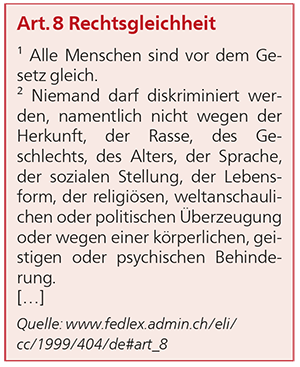 ² Niemand darf diskriminiert werden, namentlich nicht wegen der Herkunft, der Rasse, des Geschlechts, des Alters, der Sprache, der sozialen Stellung, der Lebensform, der religiösen, weltanschaulichen oder politischen Überzeugung oder wegen einer körperlichen, geistigen oder psychischen Behinderung. […]