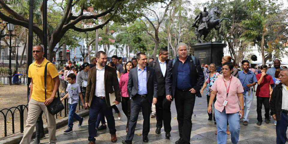 «Auf dem Platz waren sehr viele Leute, und der Aussenminister bewegt sich dort ohne grössere Sicherheitsvorkehrungen.» Von links nach rechts: der stellvertretende Aussenminister Yván Gil, Aussenminister Jorge Arreaza und der Bundestagsabgeordneter Andrej Hunko auf der Plaza Bolivar auf dem Weg zur «esquina caliente», wo Jorge Arreaza und Andrej Hunko spontane Reden hielten. (Bild zvg)